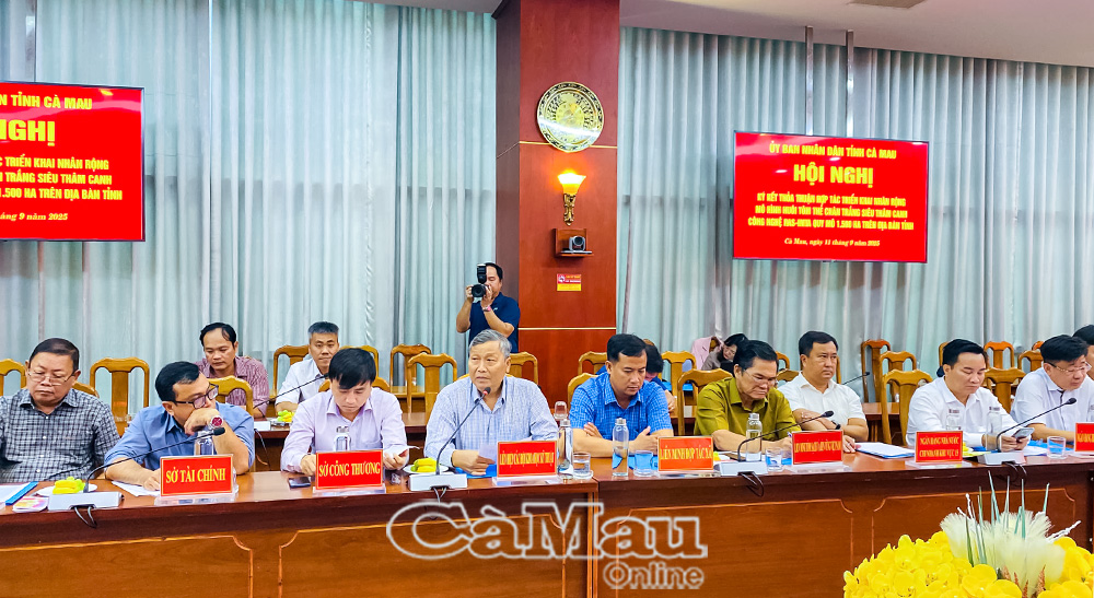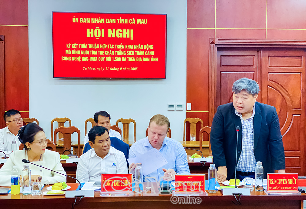 Sáng 11/9, UBND tỉnh Cà Mau tổ chức Hội nghị ký kết thoả thuận hợp tác triển khai nhân rộng mô hình nuôi tôm thẻ chân trắng siêu thâm canh công nghệ RAS-IMTA với quy mô 1.500 ha, do Phó Chủ tịch UBND tỉnh Lê Văn Sử chủ trì. Tham dự có TS. Nguyễn Nhứt, Viện Nghiên cứu Nuôi trồng thuỷ sản II, cùng đại diện các sở, ngành, ngân hàng và doanh nghiệp.
