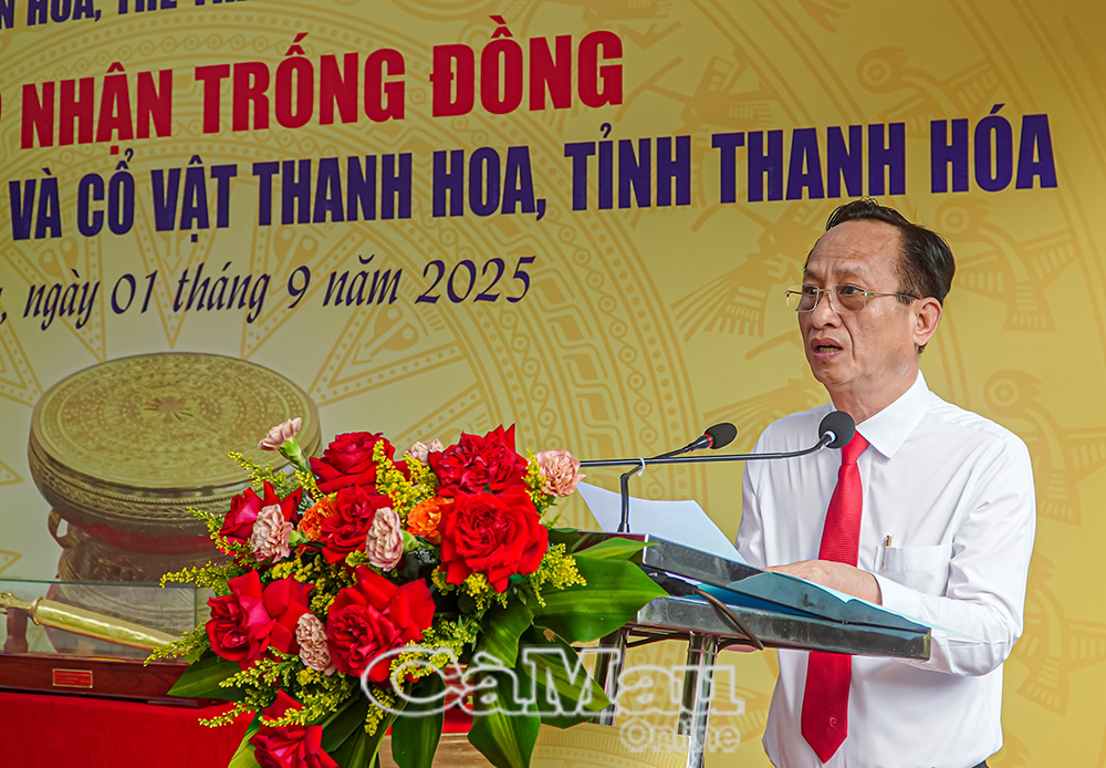 Phát biểu tại buổi lễ, đồng chí Phạm Văn Thiều, Phó Bí thư Tỉnh uỷ, Chủ tịch HĐND tỉnh Cà Mau, khẳng định: Việc Hội Di sản Văn hoá và Cổ vật Thanh Hoa trao tặng trống đồng cho tỉnh Cà Mau không chỉ mang giá trị văn hoá, lịch sử, mà còn thể hiện tình hữu nghị, đoàn kết và sự sẻ chia những giá trị tốt đẹp giữa hai vùng đất, dù cách xa về địa lý.
