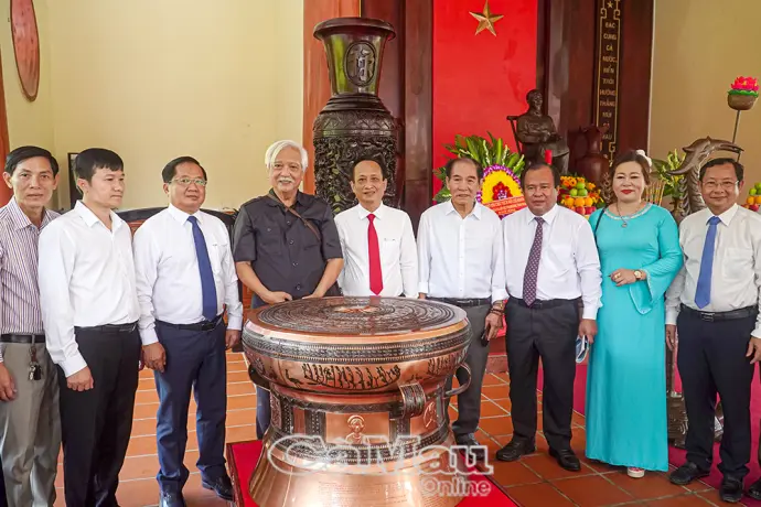 Đồng chí Phạm Văn Thiều, Phó Bí thư Tỉnh uỷ, Chủ tịch HĐND tỉnh; đồng chí Nguyễn Minh Luân, Phó Chủ tịch UBND tỉnh Cà Mau; Nhà sử học Dương Trung Quốc cùng lãnh đạo các sở, ban, ngành hai tỉnh Cà Mau - Thanh Hoá chụp ảnh lưu niệm bên trống đồng.