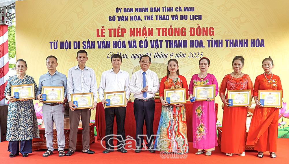 Đồng chí Nguyễn Quốc Thanh, Giám đốc Sở Văn hoá - Thể thao và Du lịch tỉnh Cà Mau, trao giấy khen cho 1 tập thể và 29 cá nhân có thành tích xuất sắc trong việc tham gia đúc, trao tặng và vận chuyển trống đồng.