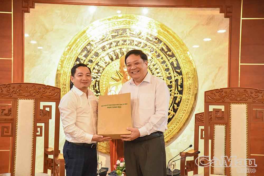 Chủ tịch UBND tỉnh Phạm Thành Ngại tặng quà cho Trung tâm Truyền hình Việt Nam khu vực Tây Nam Bộ.