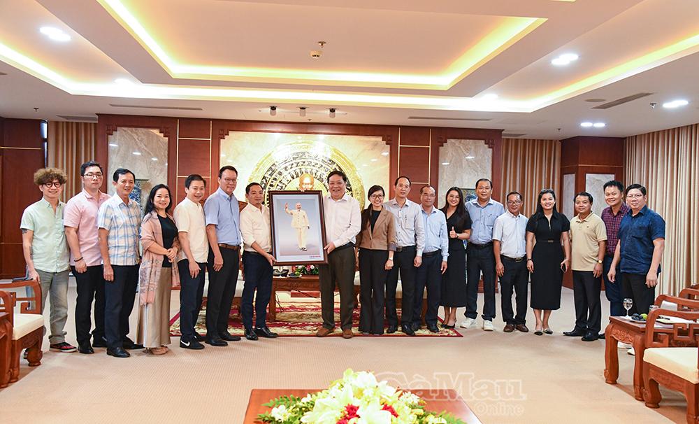 Chủ tịch UBND tỉnh Phạm Thành Ngại đón nhận bức ảnh Bác Hồ do Phó Giám đốc Trung tâm Truyền hình Việt Nam khu vực Tây Nam Bộ Phùng Văn Hiệp trao tặng và chụp ảnh lưu niệm với Đoàn công tác VTV Tây Nam Bộ.