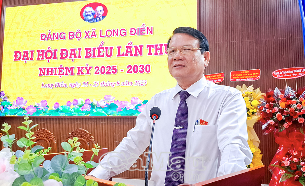 Phát biểu tại Đại hội, đồng chí Bùi Tấn Bảy, Uỷ viên BTV Tỉnh uỷ, Phó Chủ tịch HĐND tỉnh, đánh giá cao tiềm năng, lợi thế của xã Long Điền, nhấn mạnh địa phương có điều kiện thuận lợi để phát triển nuôi trồng thuỷ sản, đặc biệt là nuôi tôm siêu thâm canh, bán thâm canh gắn với sản xuất muối công nghệ cao. Bên cạnh đó, quỹ đất công còn khá lớn, tạo thuận lợi trong thu hút đầu tư xây dựng nhà máy chế biến thuỷ sản, hậu cần nghề cá, vận chuyển và lưu trữ hàng hóa. Đồng chí đề nghị Đảng bộ xã phát huy tinh thần đoàn kết, nỗ lực thực hiện mục tiêu chung, góp phần đưa tỉnh Cà Mau phát triển mạnh mẽ, bền vững.