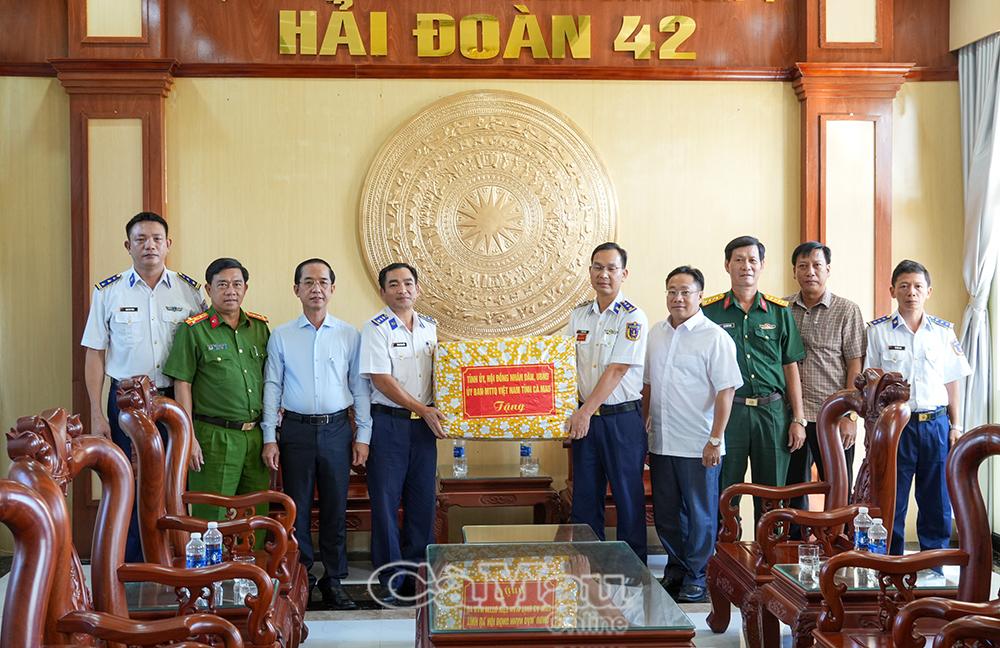 Phó Bí thư Tỉnh uỷ, Chủ tịch Ủy ban Mặt trận Tổ quốc Việt Nam tỉnh Cà Mau Hồ Thanh Thuỷ cùng các thành viên trong đoàn tặng quà cho các cán bộ, chiến sĩ Hải đội 42.