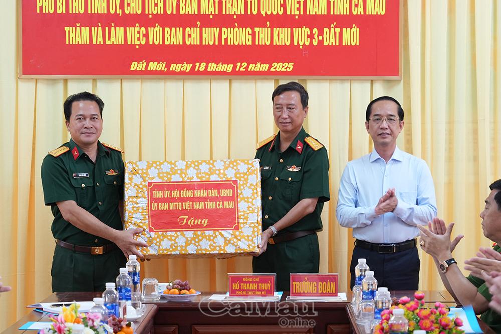 Dịp này, Phó Bí thư Tỉnh uỷ, Chủ tịch Uỷ ban Mặt trận Tổ quốc Việt Nam tỉnh Cà Mau Hồ Thanh Thuỷ tặng các phần quà thể hiện tình cảm, sự quan tâm của lãnh đạo tỉnh đối với các lực lượng vũ trang đang đứng chân trên địa bàn tỉnh.