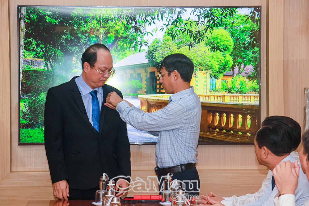 Ông Nguyễn Văn Dương, Phó Giám đốc Khu di tích Chủ tịch Hồ Chí Minh tại Phủ Chủ tịch, trao tặng Huy hiệu Chủ tịch Hồ Chí Minh cho đồng chí Nguyễn Hồ Hải, Bí thư Tỉnh uỷ Cà Mau.