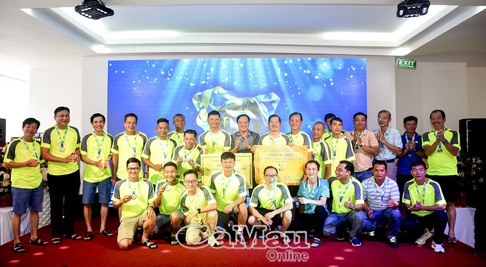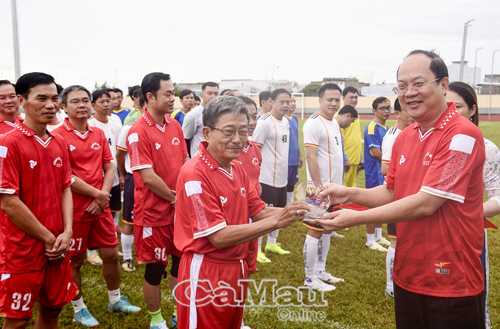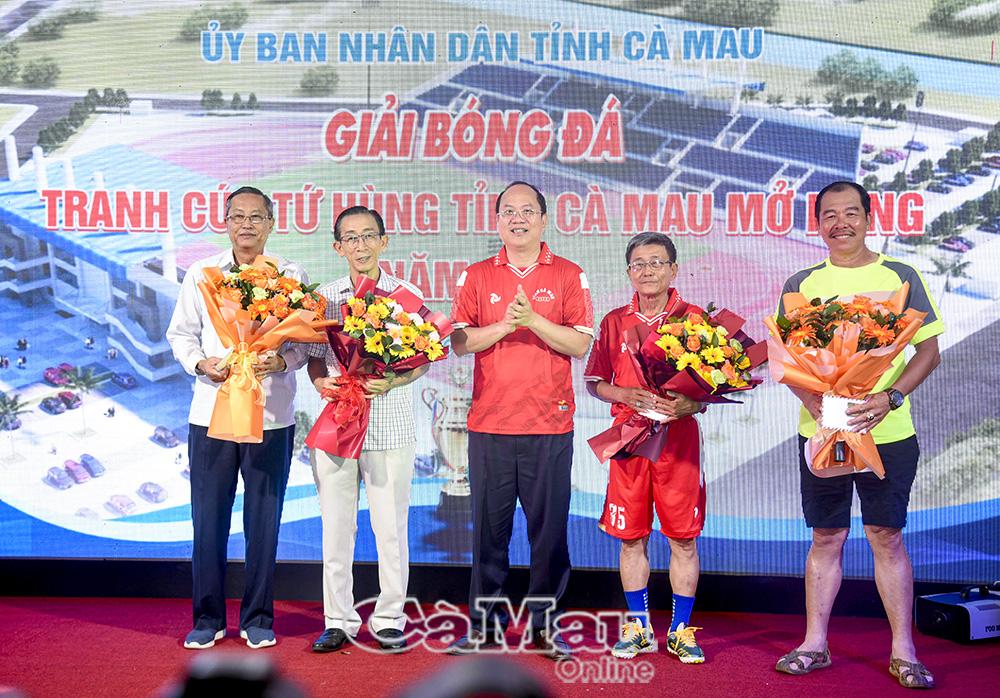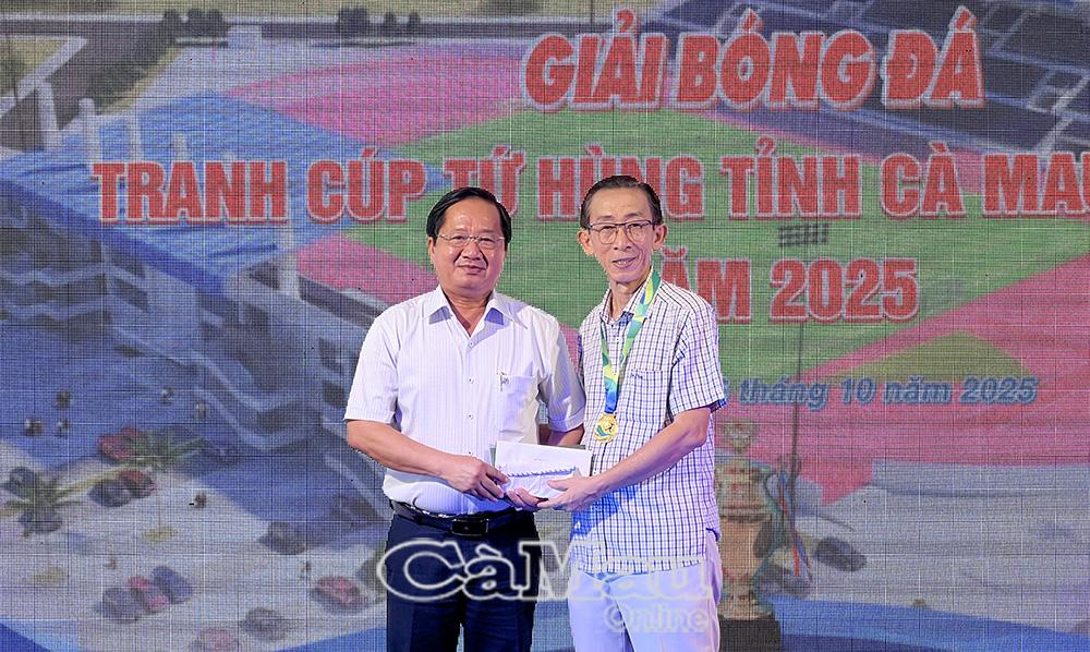 Bí thư Tỉnh uỷ Cà Mau Nguyễn Hồ Hải trao giải cho các cầu thủ lớn tuổi nhất giải.
