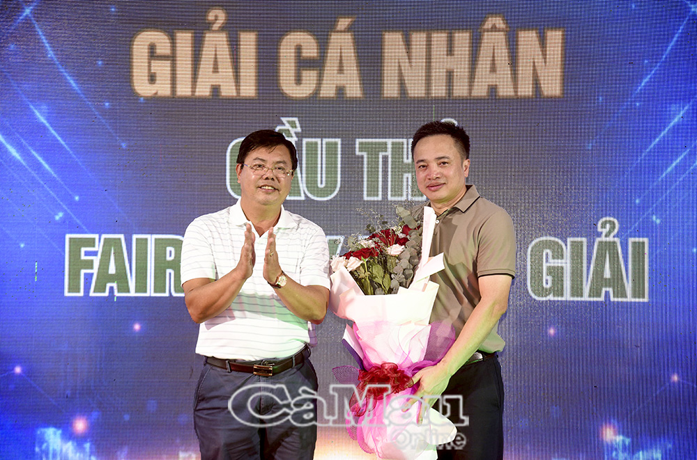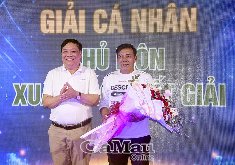 Chủ tịch UBND tỉnh Cà Mau Phạm Thành Ngại trao giải cho thủ môn xuất sắc nhất.