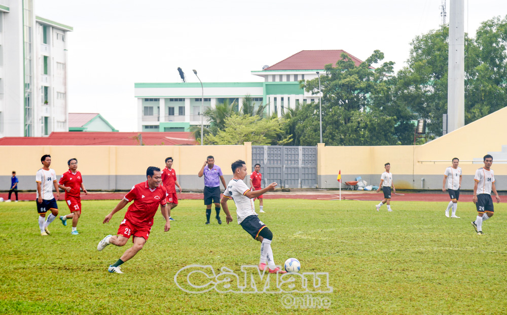Pha tranh bóng của cầu thủ 2 đội bóng đá cán bộ, công chức, viên chức tỉnh Cà Mau và cán bộ, công chức, viên chức TP Hồ Chí Minh.