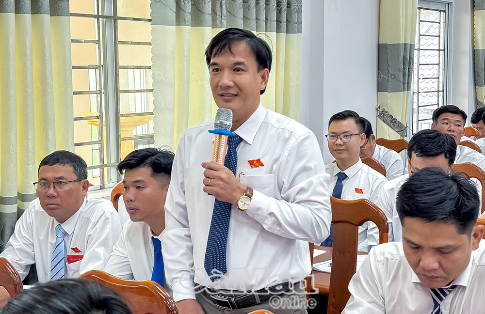 Đại biểu Trần Chí Phong, Hiệu trưởng Trường THPT Quách Văn Phẩm phát biểu đóng góp nhiều ý kiến tâm huyết về công tác giáo dục, nâng cao chất lượng dạy và học trên địa bàn xã.