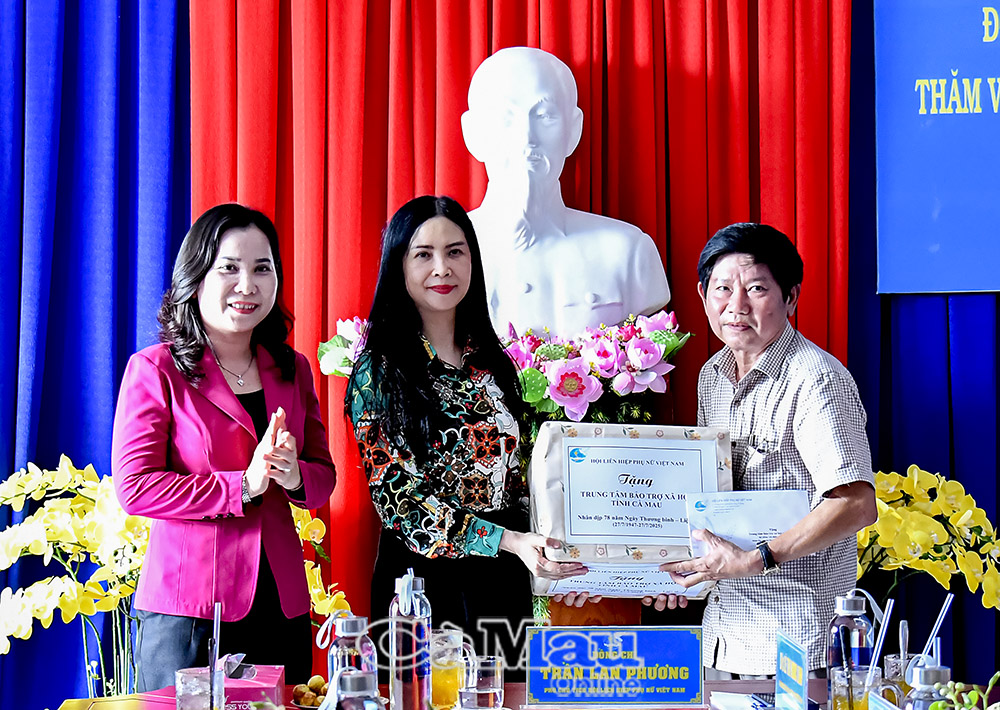 Phó Chủ tịch Hội LHPN Việt Nam Trần Lan Phương cùng Chủ tịch Hội LHPN tỉnh Cà Mau Lê Thị Ngọc Linh trao quà tại Trung tâm Bảo trợ xã hội tỉnh.