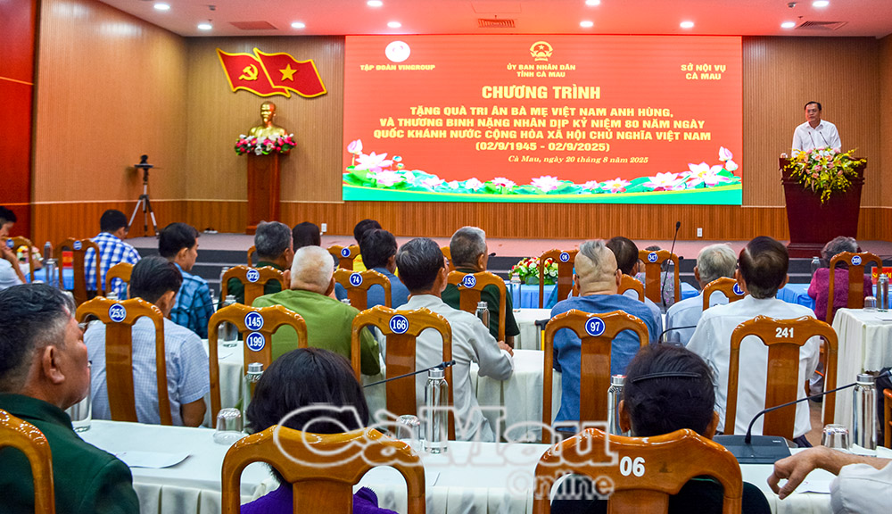 Phát biểu tại buổi lễ, ông Ngô Vũ Thăng, Phó Chủ tịch UBND tỉnh, cho biết: Hiện Cà Mau đang quản lý khoảng 185.000 hồ sơ người có công; trong đó có 21.681 đối tượng hưởng trợ cấp thường xuyên với tổng kinh phí chi trả trên 60 tỷ đồng mỗi tháng. Toàn tỉnh còn 71 Mẹ VNAH và 120 thương binh có tỷ lệ thương tật từ 81% trở lên.