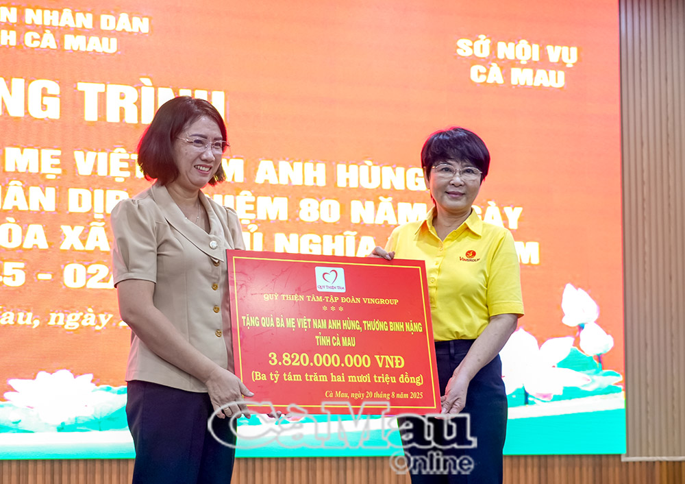 Riêng tại Cà Mau, có 191 Mẹ VNAH và thương binh nặng được nhận quà tri ân với tổng kinh phí hơn 3,8 tỷ đồng. Những phần quà không chỉ mang giá trị vật chất, mà còn thể hiện lòng biết ơn sâu sắc, sự tri ân chân thành của cán bộ, nhân viên Tập đoàn VinGroup đối với những người đã hy sinh, cống hiến vì độc lập, tự do của Tổ quốc.