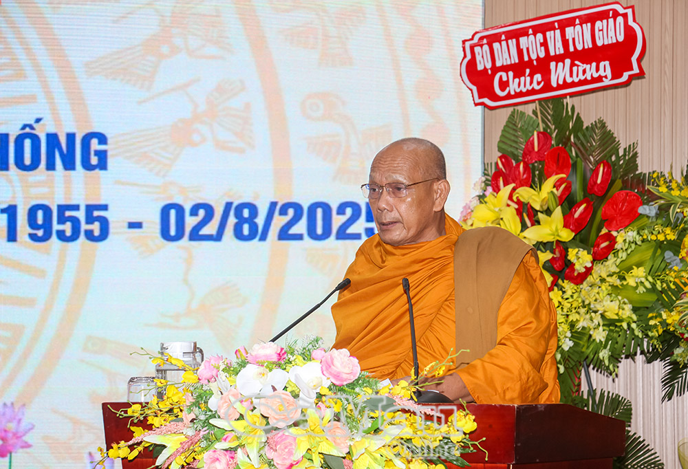 Hoà thượng Thạch Hà, Trưởng Ban trị sự Giáo hội Phật giáo Việt Nam tỉnh Cà Mau, phát biểu tham luận tại buổi họp mặt.