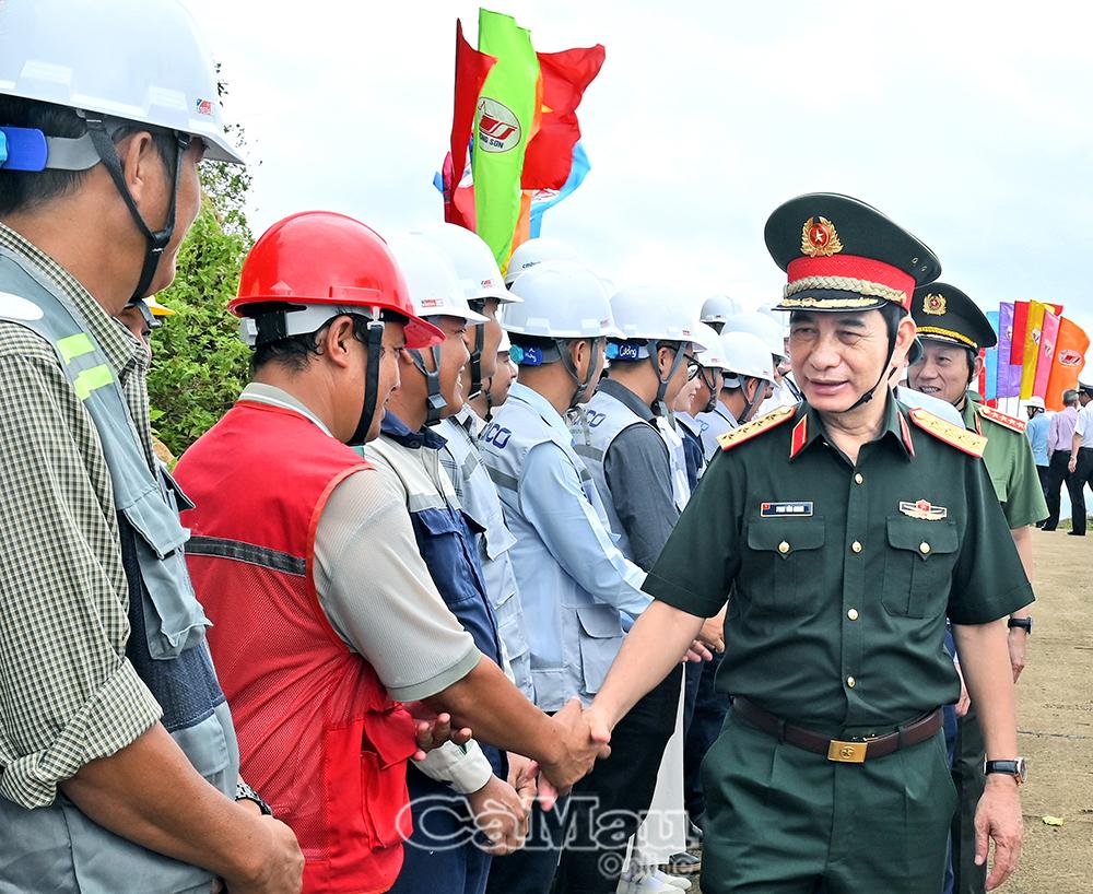 Đại tướng Phan Văn Giang, Uỷ viên Bộ Chính trị, Bộ trưởng Bộ Quốc phòng, động viên những người xây dựng các công trình trọng điểm tại đảo Hòn Khoai.