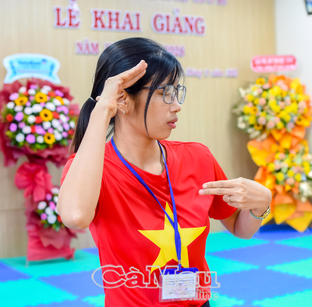 Cô Vũ Thị Hà Giang có mặt xuyên suốt buổi lễ khai giảng để phiên dịch ký hiệu cho các em học sinh.
