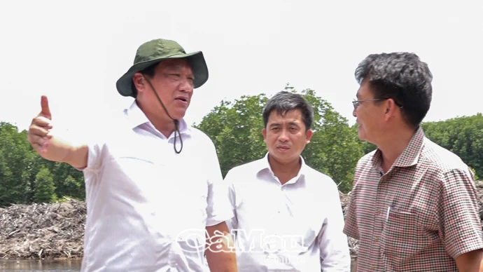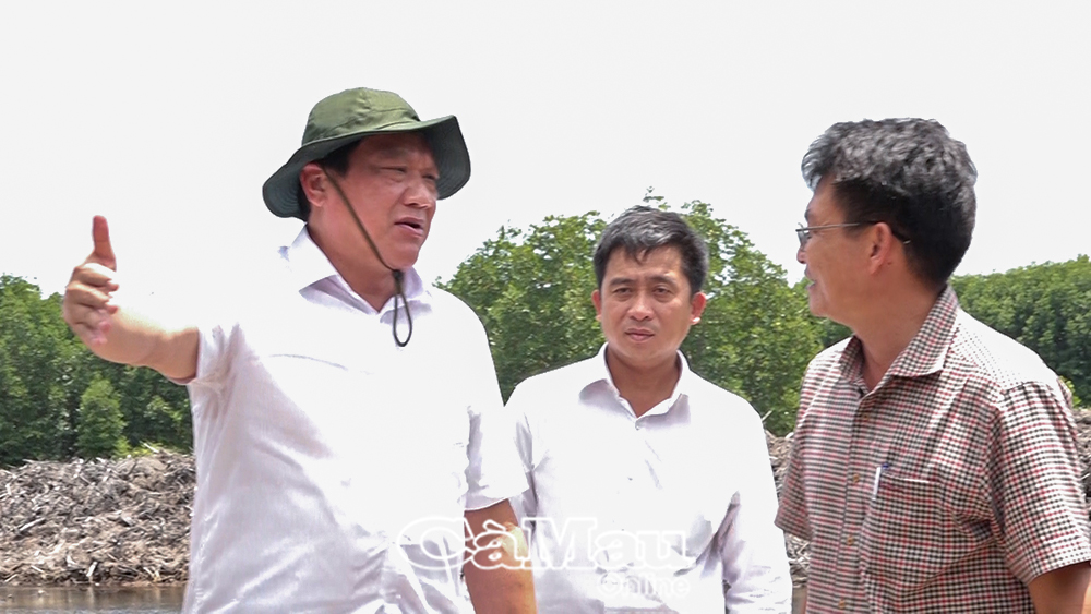 Phó Chủ tịch UBND tỉnh Cà Mau (bìa trái) ghi nhận và đánh giá cao nỗ lực của các đơn vị trong công tác chuẩn bị mặt bằng tại điểm dự kiến khởi công các công trình trọng điểm trên địa bàn xã Đất Mũi.