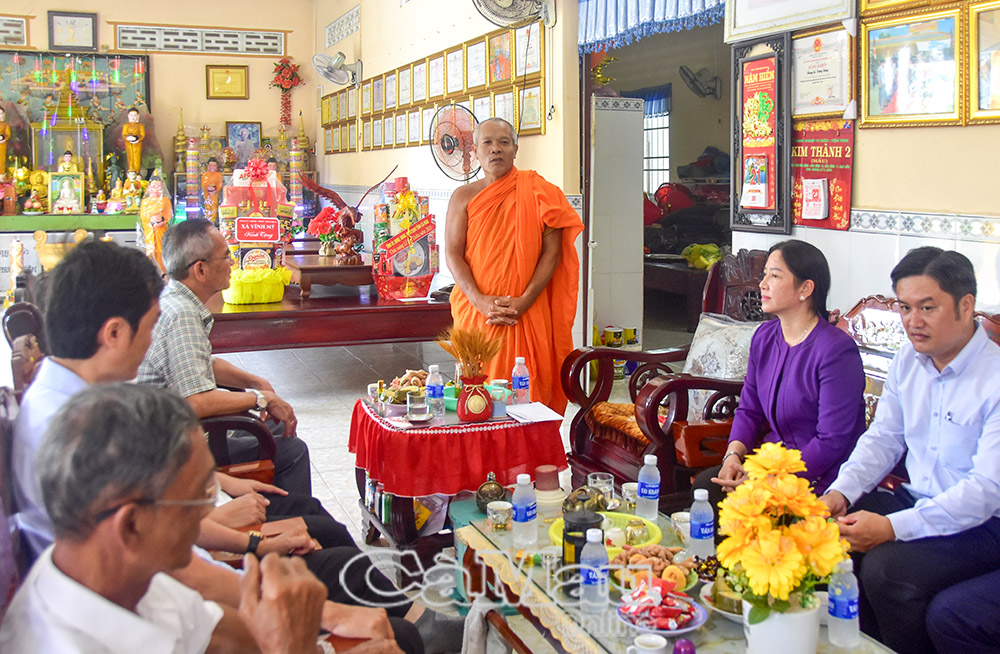 Đáp lời đoàn công tác, các vị Thượng tọa, Đại đức bày tỏ lòng cảm ơn sâu sắc trước sự quan tâm của Đảng, Nhà nước và chính quyền địa phương đã chăm lo cho đồng bào Khmer cả về vật chất lẫn tinh thần. Các vị khẳng định, sẽ tiếp tục đồng hành, vận động Phật tử và nhân dân thực hiện tốt đường lối, chủ trương của Đảng, chính sách pháp luật của Nhà nước; tham gia tích cực các phong trào, cuộc vận động ở địa phương, góp phần xây dựng quê hương ngày càng giàu đẹp.