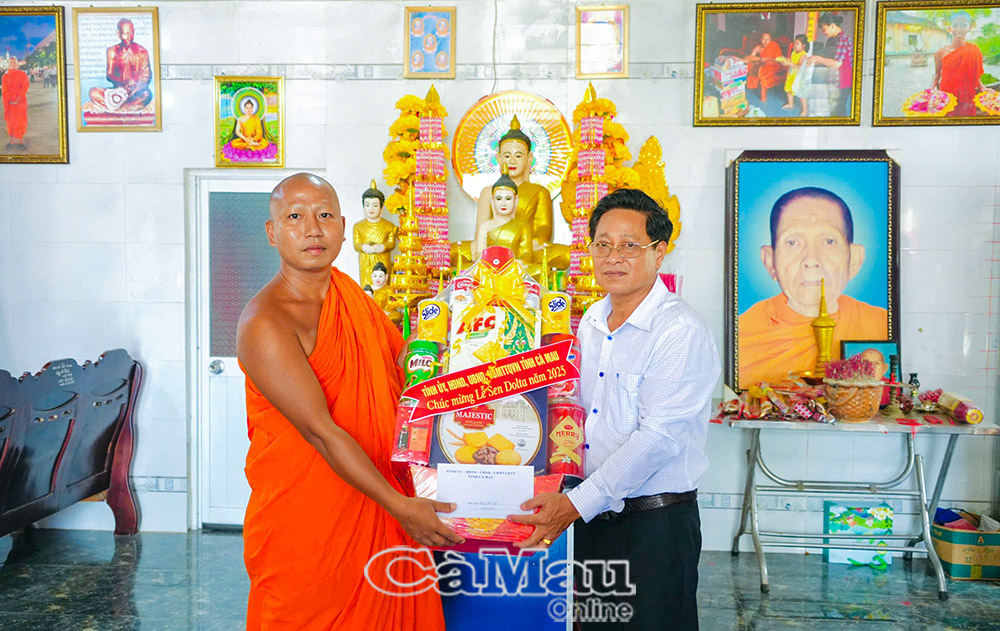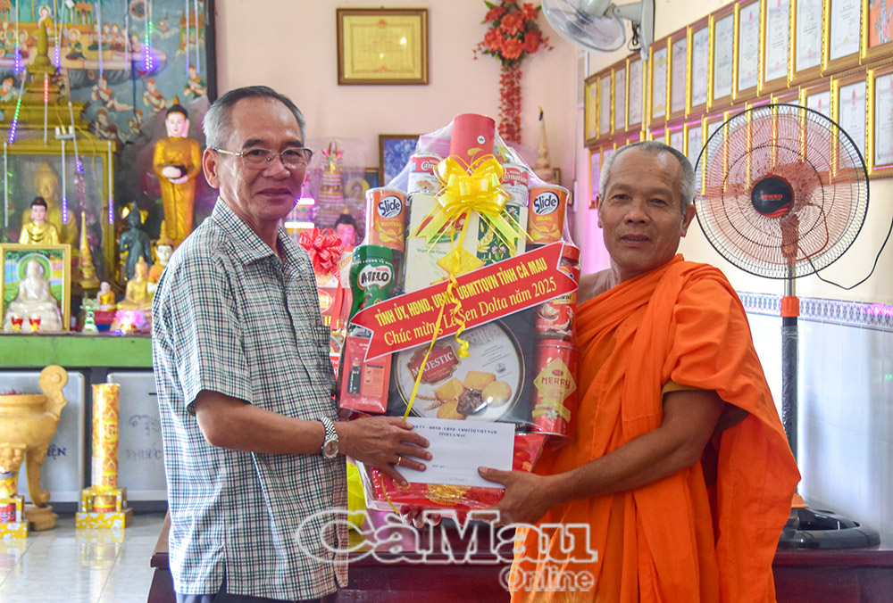 Đồng chí Bùi Tấn Bảy chúc mừng lễ Sene Dolta đến Phó trụ trì chùa Đầu Sấu (xã Hồng Dân).