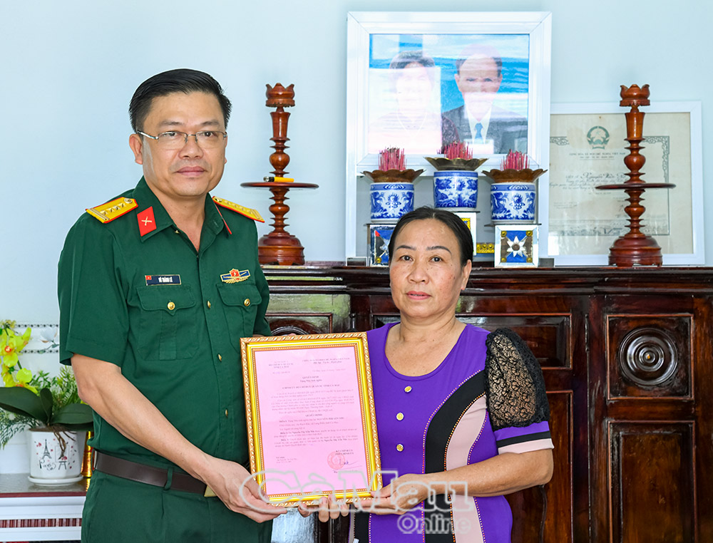 Đại tá Võ Thành Lê, Chính uỷ Bộ CHQS tỉnh, trao quyết định nhà tình nghĩa cho gia đình bà Nguyễn Yến Nhi.