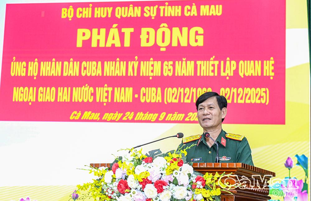 Sáng 24/9, Bộ Chỉ huy Quân sự (CHQS) tỉnh Cà Mau tổ chức phát động quyên góp, ủng hộ Nhân dân Cuba vượt qua khó khăn. Đại tá Lê Quang Luật, Phó Chính uỷ Bộ CHQS tỉnh dự và phát biểu tại buổi phát động.