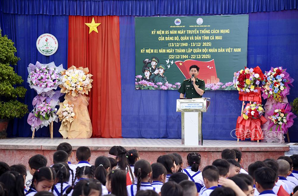 Sáng 15/12, Đồn Biên phòng Nhà Mát phối hợp với Trường Tiểu học Phùng Ngọc Liêm (phường Bạc Liêu) tổ chức lễ chào cờ kết hợp tuyên truyền kỷ niệm 85 năm Ngày truyền thống cách mạng của Đảng bộ, quân và dân tỉnh Cà Mau (13/12/1940 - 13/12/2025) và 81 năm Ngày thành lập Quân đội nhân dân Việt Nam (22/12/1944 - 22/12/2025).