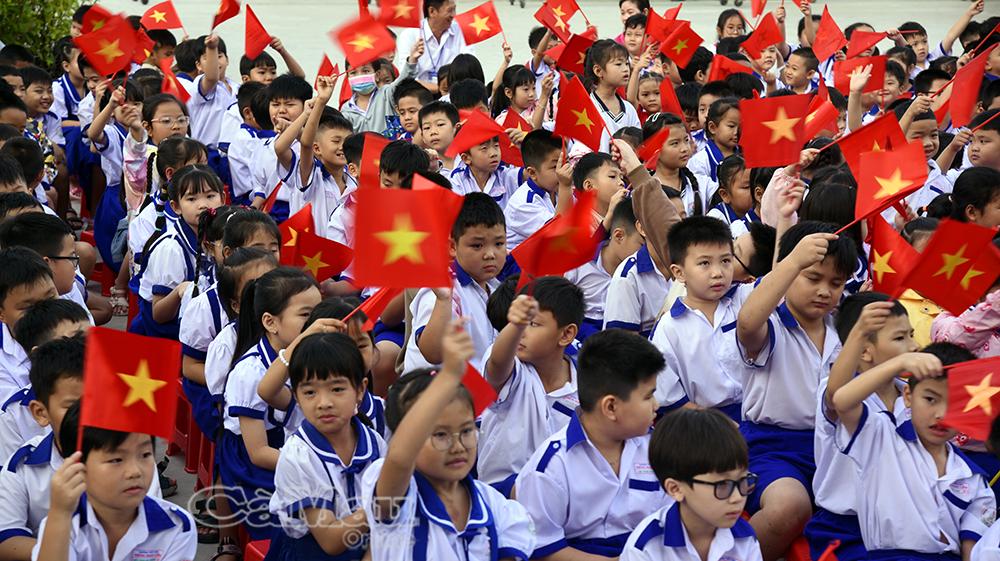 Các em học sinh phấn khởi thể hiện tình yêu Tổ quốc.