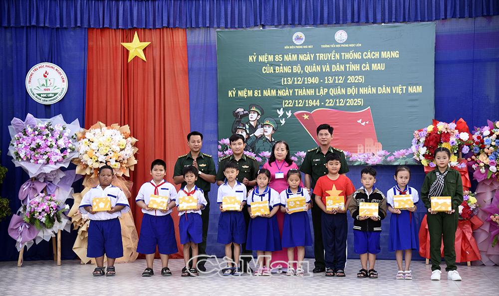 Đồn Biên phòng Nhà Mát và Ban Giám hiệu Trường Tiểu học Phùng Ngọc Liêm trao quà động viên học sinh có hoàn cảnh khó khăn.