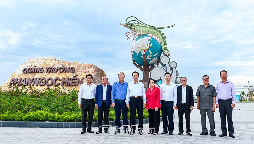 Nguyên Thủ tướng Chính phủ Nguyễn Tấn Dũng và lãnh đạo tỉnh chụp ảnh lưu niệm tại Quảng trường Phan Ngọc Hiển - nơi tổ chức Ngày hội Cua Cà Mau lần thứ II/2025.