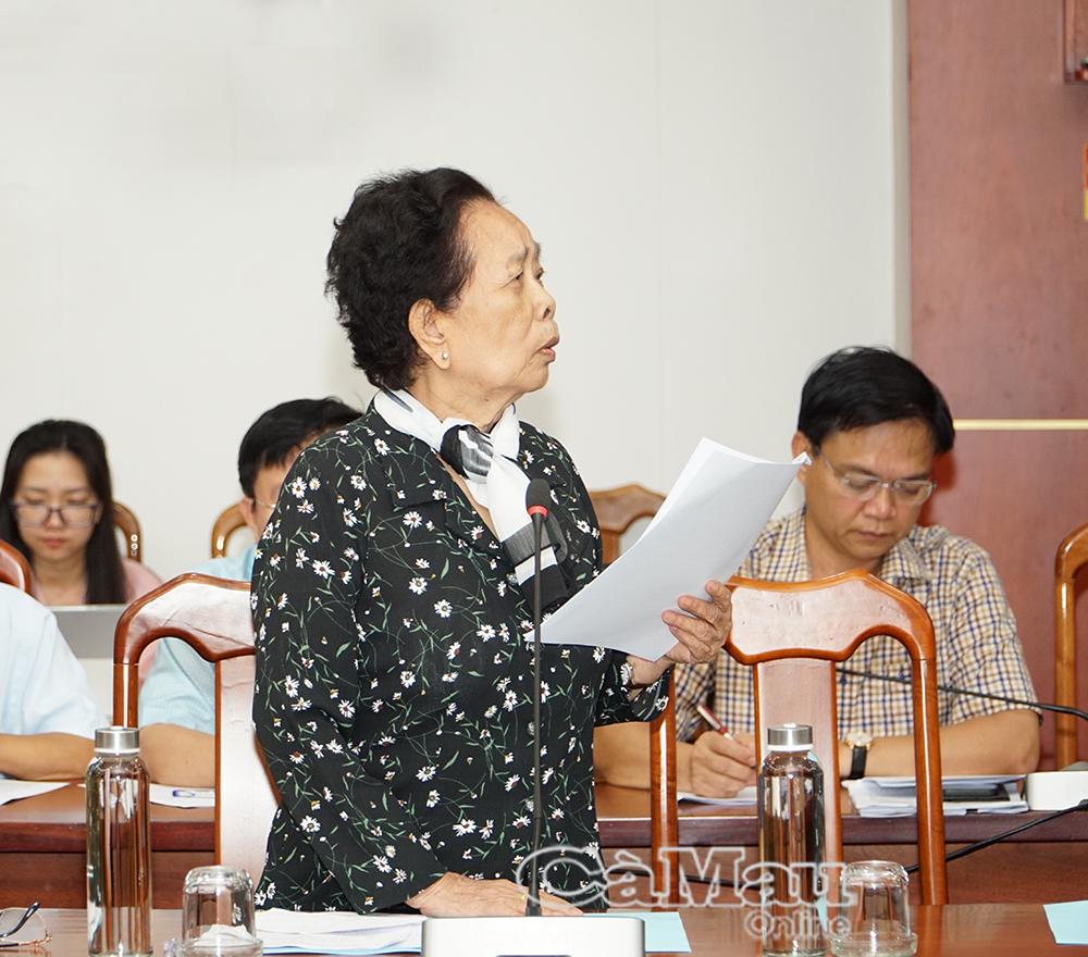 Đồng chí Cao Kim Dân, nguyên Chủ tịch Hội LHPN tỉnh Minh Hải, nêu ý kiến đóng góp.