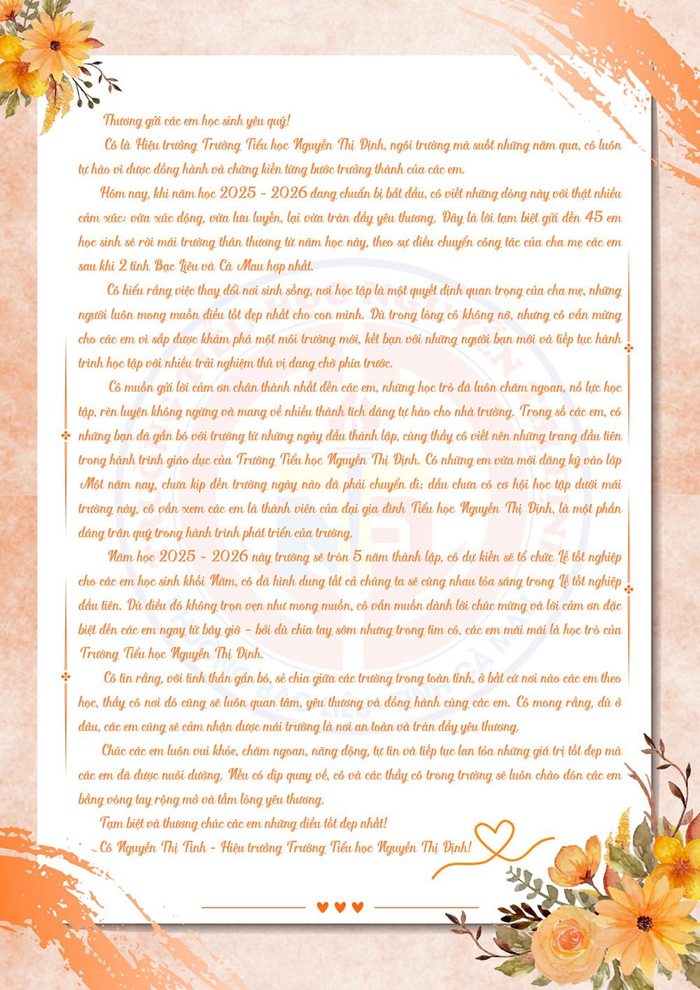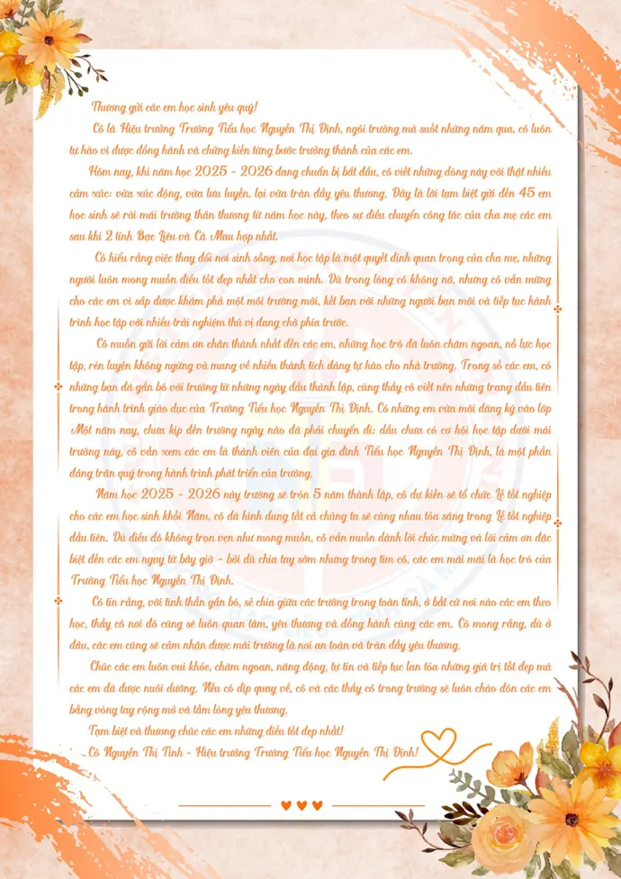 Lời chào của cô hiệu trưởng Trường Tiểu học Nguyễn Thị Định gửi đến các học sinh phải chuyển trường sau khi hai tỉnh hợp nhất, là lời nhắn nhủ chan chứa tình thương và động viên.