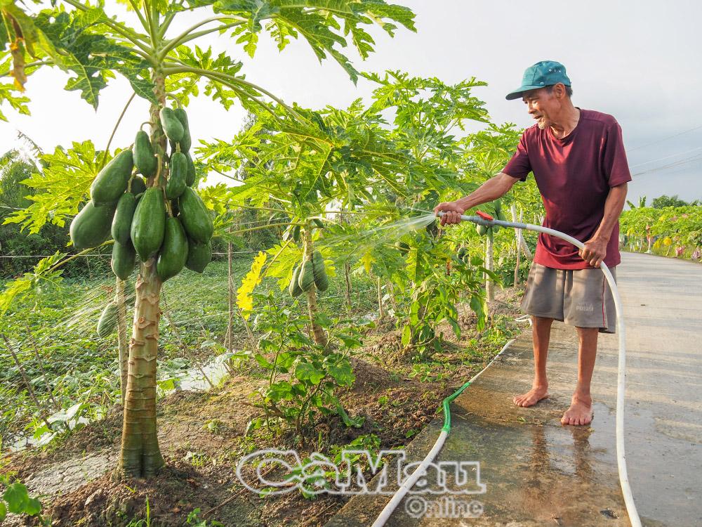 Thương binh Đỗ Tam Giang, khóm Thạnh Điền, Phường Lý Văn Lâm, tận dụng đất ven lộ trồng đu đủ, dưa leo, rau diếp cá… tạo thu nhập thêm cho gia đình.