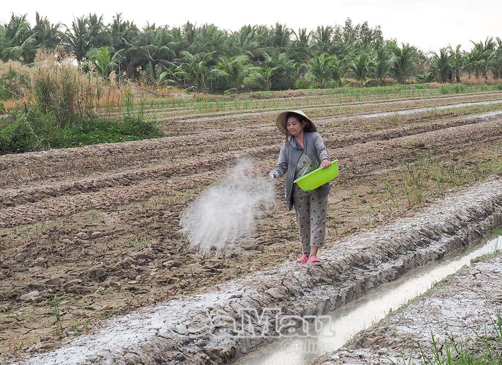 Bà Nguyễn Thị Thu, khóm Thạnh Điền, Phường Lý văn Lâm, bón vôi hạ phèn, chuẩn bị đất trồng vụ dưa hấu Tết.