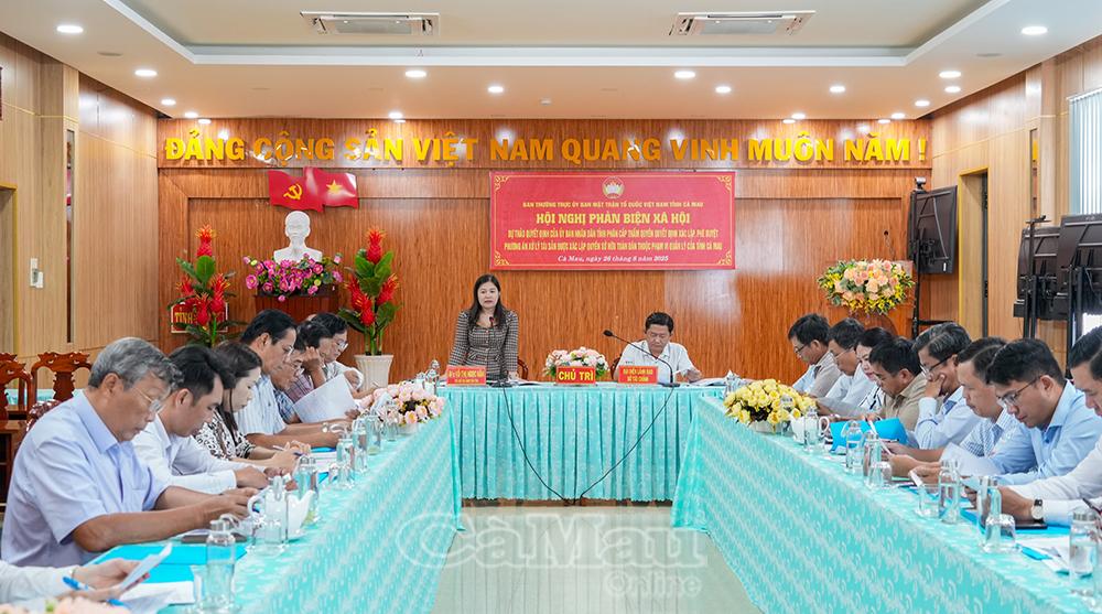Sáng 26/8, Ban Thường trực Uỷ ban MTTQ Việt Nam tỉnh Cà Mau tổ chức Hội nghị phản biện xã hội đối với dự thảo Quyết định của UBND tỉnh về phân cấp thẩm quyền xác lập và phê duyệt phương án xử lý tài sản được xác lập quyền sở hữu toàn dân trên địa bàn tỉnh.