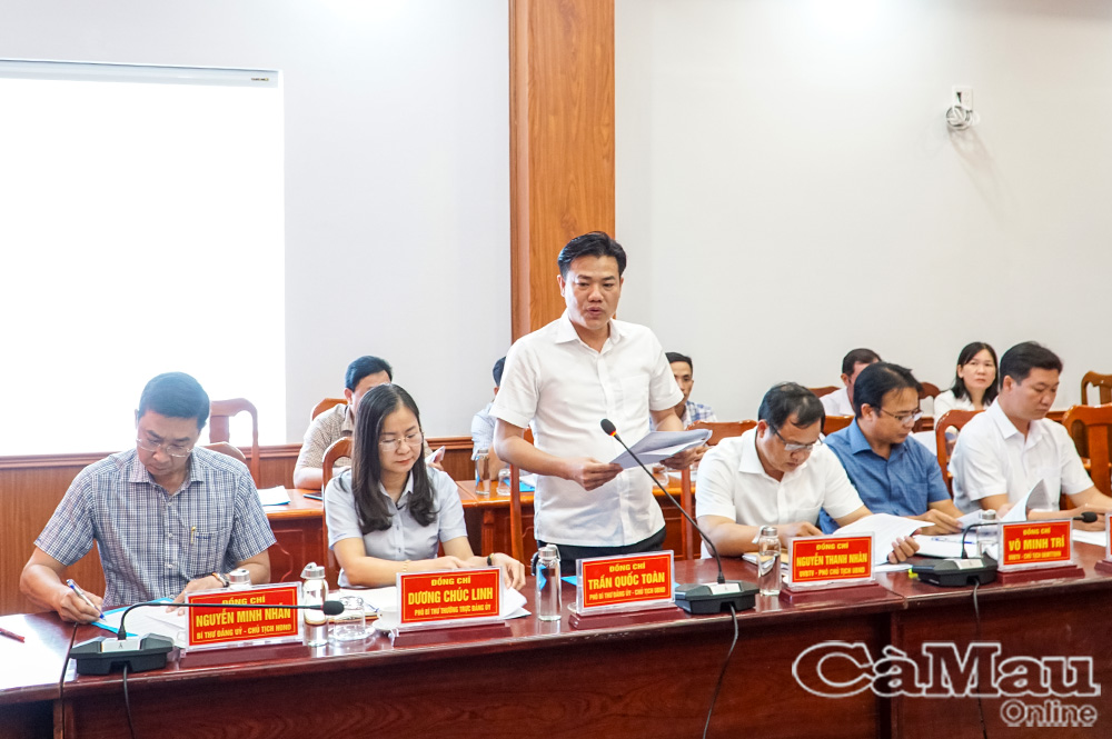 Đồng chí Trần Quốc Toàn, Phó Bí thư Đảng uỷ, Chủ tịch UBND Xã Hồ Thị Kỷ, báo cáo với đoàn công tác.