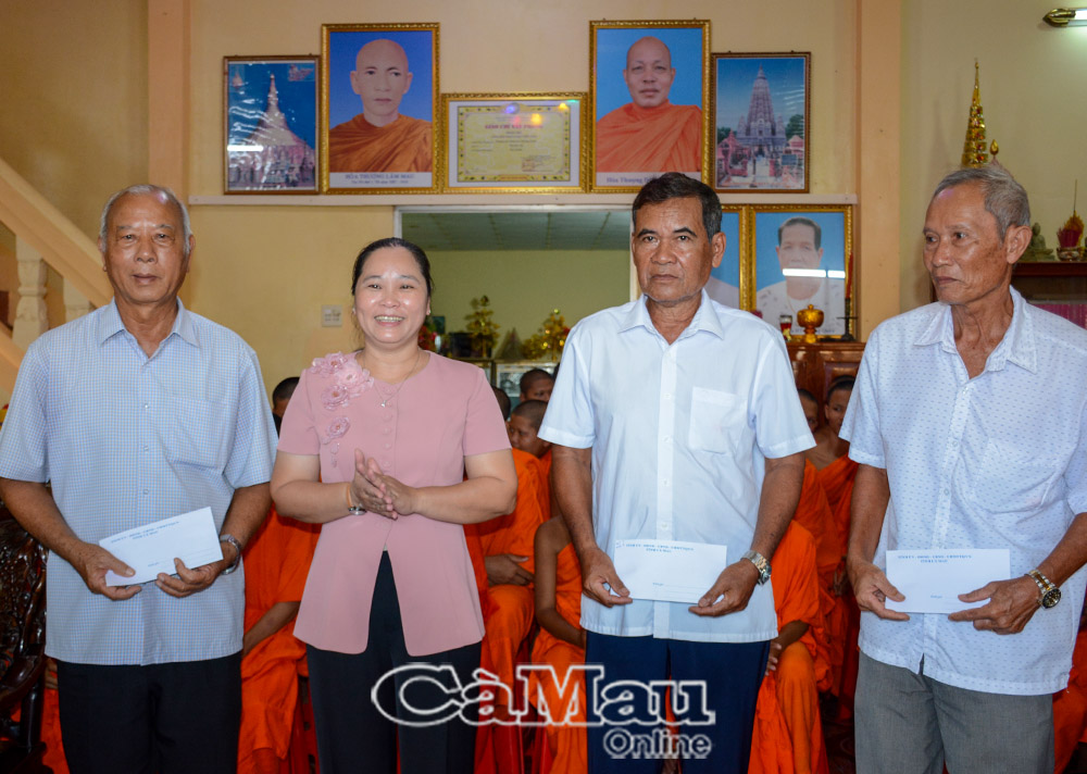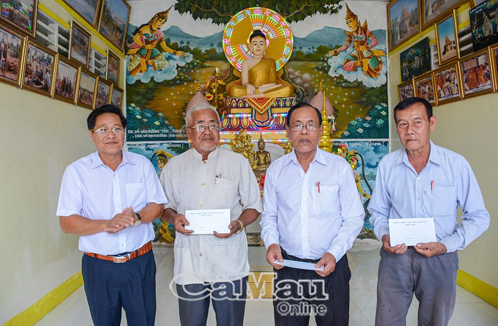 Đồng chí Bùi Tấn Bảy tặng quà các vị sư Chùa Xiêm Cán.