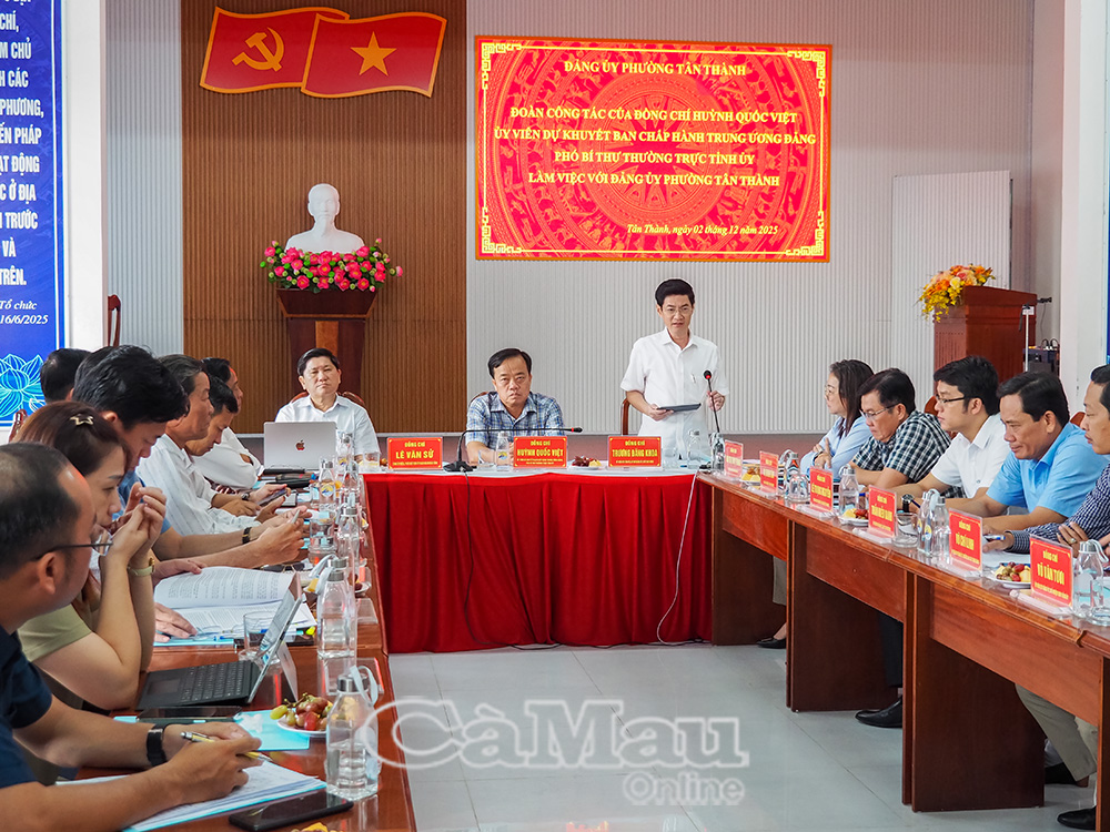 Chiều 2/12, đồng chí Huỳnh Quốc Việt, Uỷ viên dự khuyết Ban Chấp hành Trung ương Đảng, Phó Bí thư Thường trực Tỉnh uỷ Cà Mau, làm việc với Đảng uỷ phường Tân Thành. Tham gia cùng đoàn có đồng chí Lê Văn Sử, Phó Chủ tịch UBND tỉnh; đại diện lãnh đạo các sở, ban, ngành tỉnh.