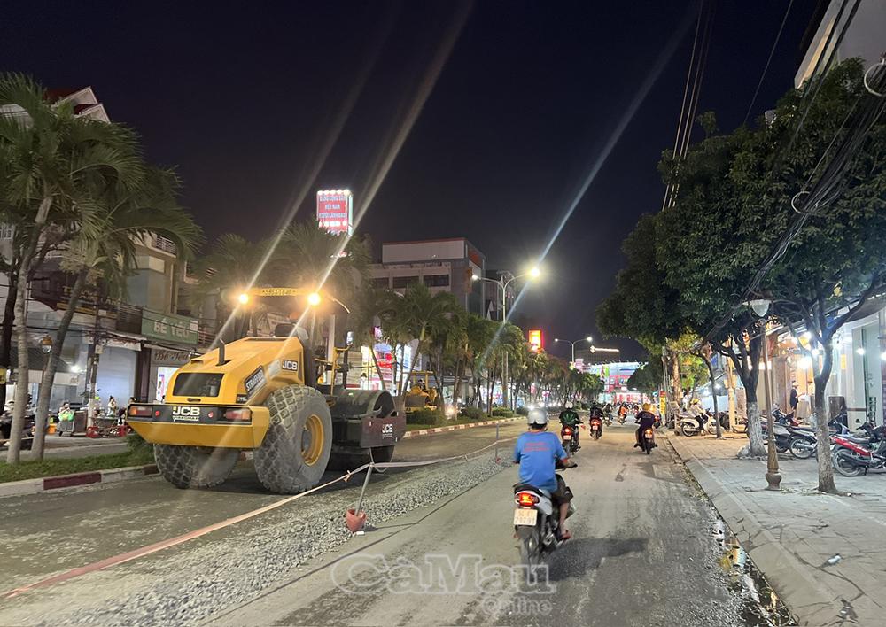 Công nhân tăng ca, thi công cả ban đêm để đẩy nhanh tiến độ nâng cấp tuyến đường Trần Phú (phường Bạc Liêu), kịp hoàn thành trước năm mới 2026 .