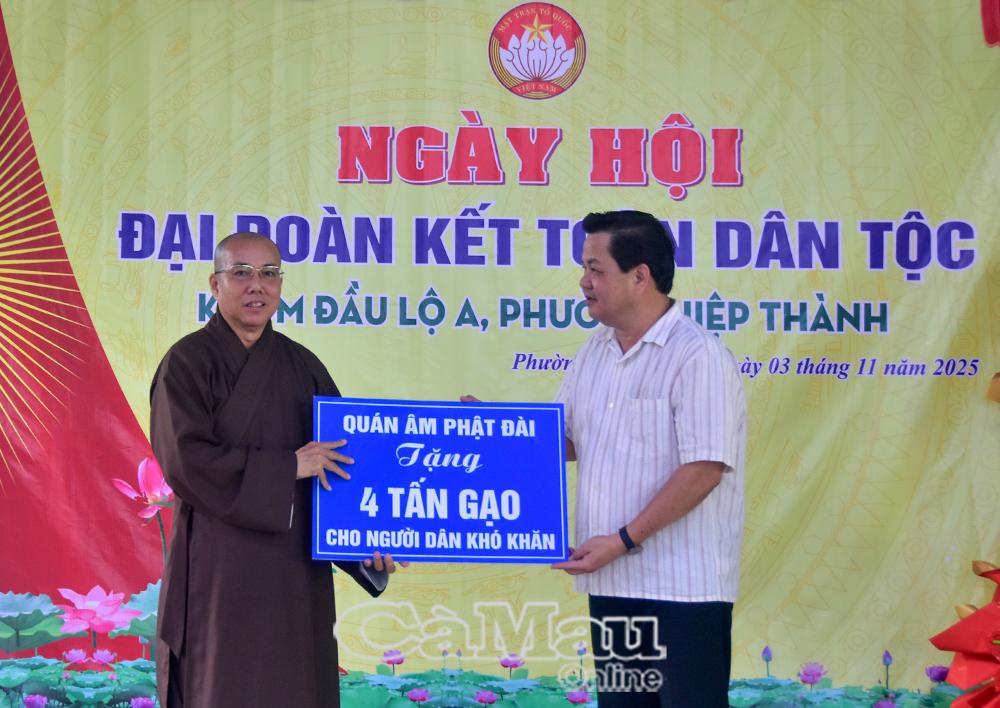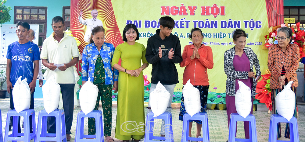 Tại ngày hội, Tỉnh uỷ - HĐND - UBND - Uỷ ban MTTQ Việt Nam tỉnh trao tặng 5 phần quà (1 triệu đồng/phần) cho các hộ có hoàn cảnh khó khăn. Phường Hiệp Thành hỗ trợ 2 căn nhà Đại đoàn kết (trị giá 60 triệu đồng/căn) cho hộ bà Sơn Thị Bó (khóm Giồng Giữa A) và hộ Võ Đại Nhân (khóm Biển Tây B). Ban Trị sự Quán Âm Phật Đài trao 4 tấn gạo giúp người dân nghèo vượt khó.