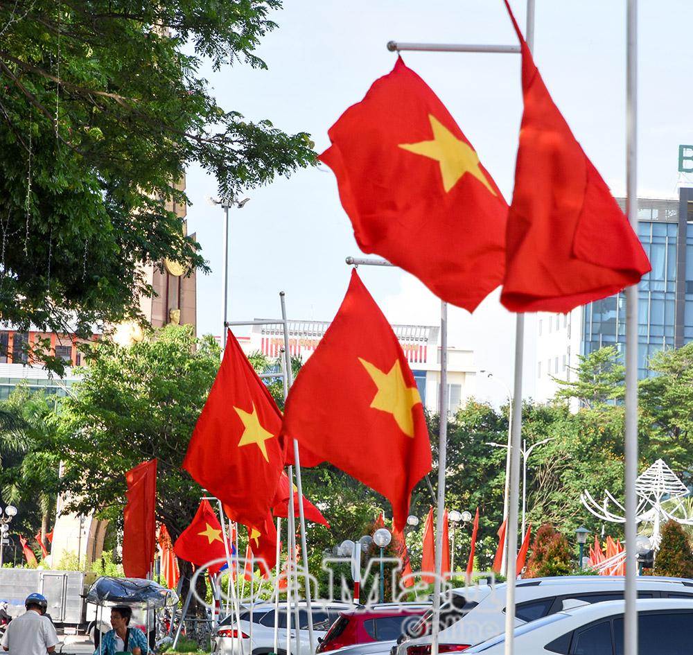 Cờ đỏ sao vàng rực rỡ, tung bay khắp tuyến phố.