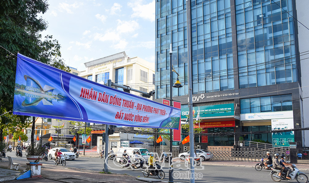 Rất nhiều băng rôn tuyên truyền sự kiện quan trọng hợp nhất 2 tỉnh được lắp đặt tại các trục đường chính.