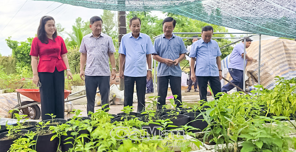 Đồng chí Huỳnh Văn Hiền, Bí thư Đảng uỷ xã Đầm Dơi (thứ ba từ trái sang), tham quan mô hình trồng màu của hộ dân ở Ấp 1.