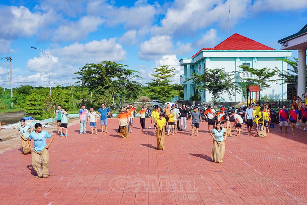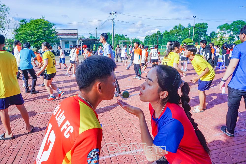 Các vận động viên tham gia thi đấu môn chuyền chanh, nhảy bao bố trong không khí vui tươi, phấn khởi.