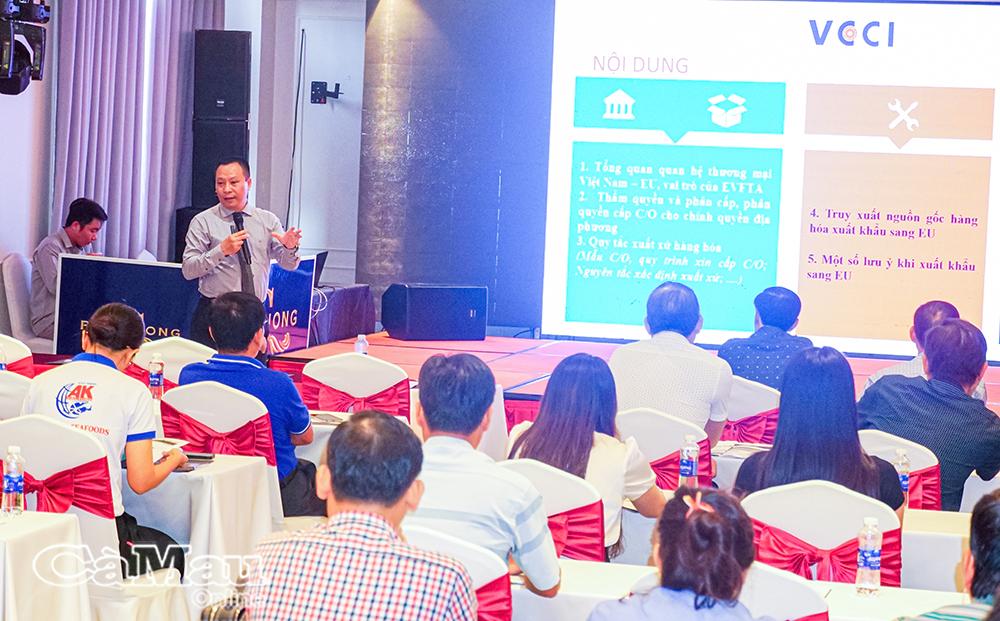 Đại biểu được nghe báo cáo viên trình bày tổng quan về quan hệ thương mại Việt Nam - EU, vai trò của Hiệp định EVFTA, cùng hướng dẫn cụ thể về quy tắc xuất xứ hàng hóa, quy trình xin cấp Giấy chứng nhận xuất xứ (C/O) và công tác truy xuất nguồn gốc đối với hàng hóa xuất khẩu sang thị trường EU.