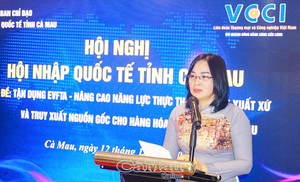 Bà Võ Thị Thu Hương, đại diện Liên đoàn Thương mại và Công nghiệp Việt Nam (VCCI) Chi nhánh Đồng bằng sông Cửu Long chia sẻ tại hội nghị