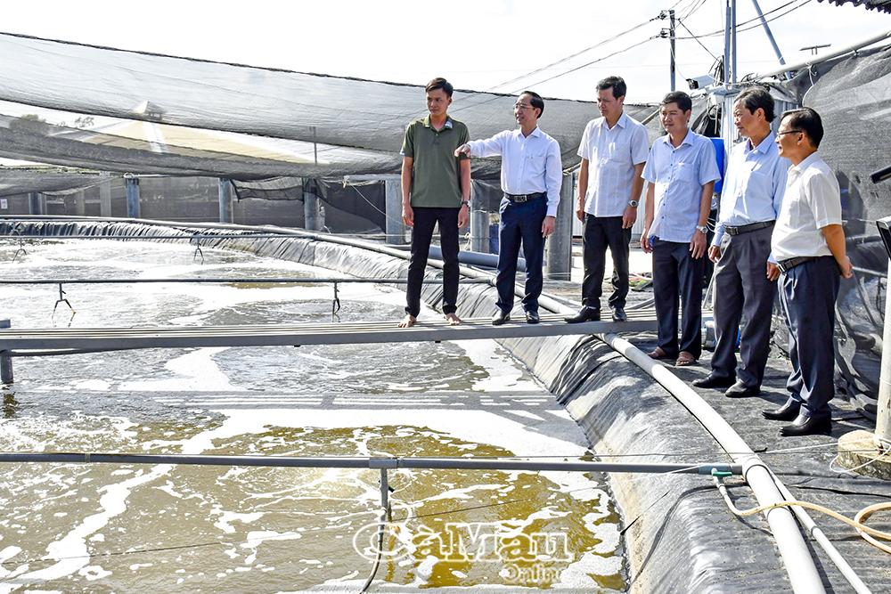 Đồng chí Hồ Thanh Thuỷ cùng đoàn công tác khảo sát mô hình nuôi tôm thẻ chân trắng siêu thâm canh tuần hoàn, ít thay nước trên địa bàn xã Cái Nước