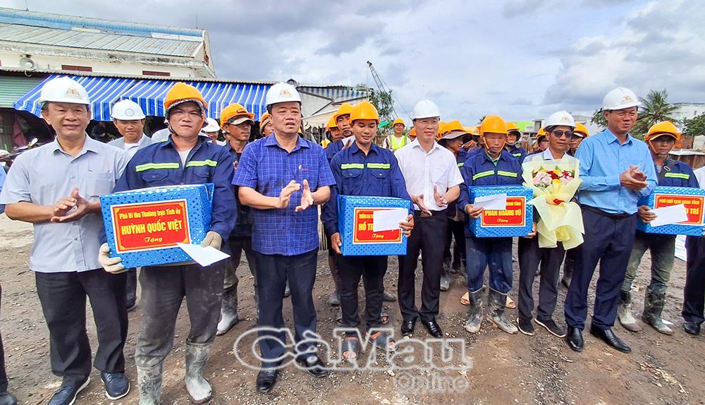Phó Bí thư Thường trực Tỉnh uỷ và đoàn cán bộ Tỉnh uỷ tặng quà, động viên kỹ sư, công nhân tại công trường.