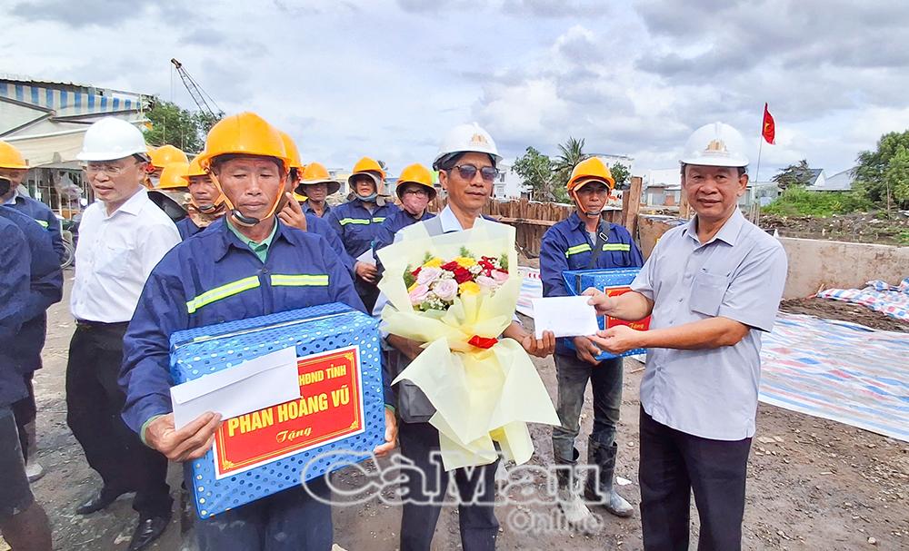 Đồng chí Hồ Trung Việt, Uỷ viên BTV Tỉnh uỷ, Trưởng Ban Tuyên giáo và Dân vận Tỉnh uỷ, tặng quà công nhân tại công trường.