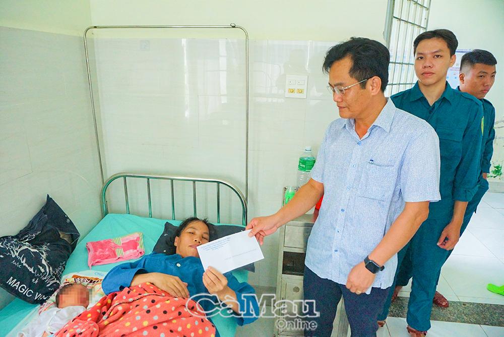 Đồng chí Ngô Minh Toại, Chủ tịch UBND xã Phan Ngọc Hiển tặng quà cho em bé vừa chào đời ngay ngày Quốc khánh 2/9.