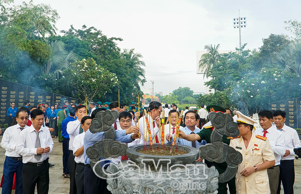 Bí thư Tỉnh uỷ Nguyễn Hồ Hải; Phó Bí thư Tỉnh uỷ, Chủ tịch UBND tỉnh Phạm Thành Ngại dâng hương tại Đài tưởng niệm các anh hùng liệt sĩ (phường Bạc Liêu).